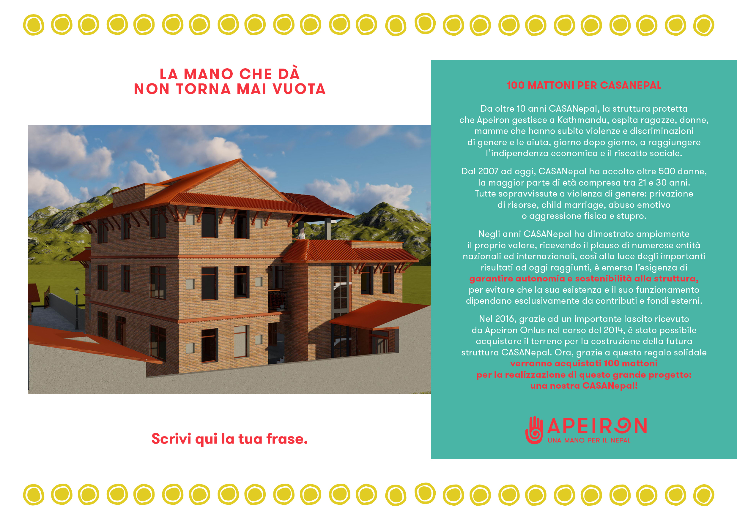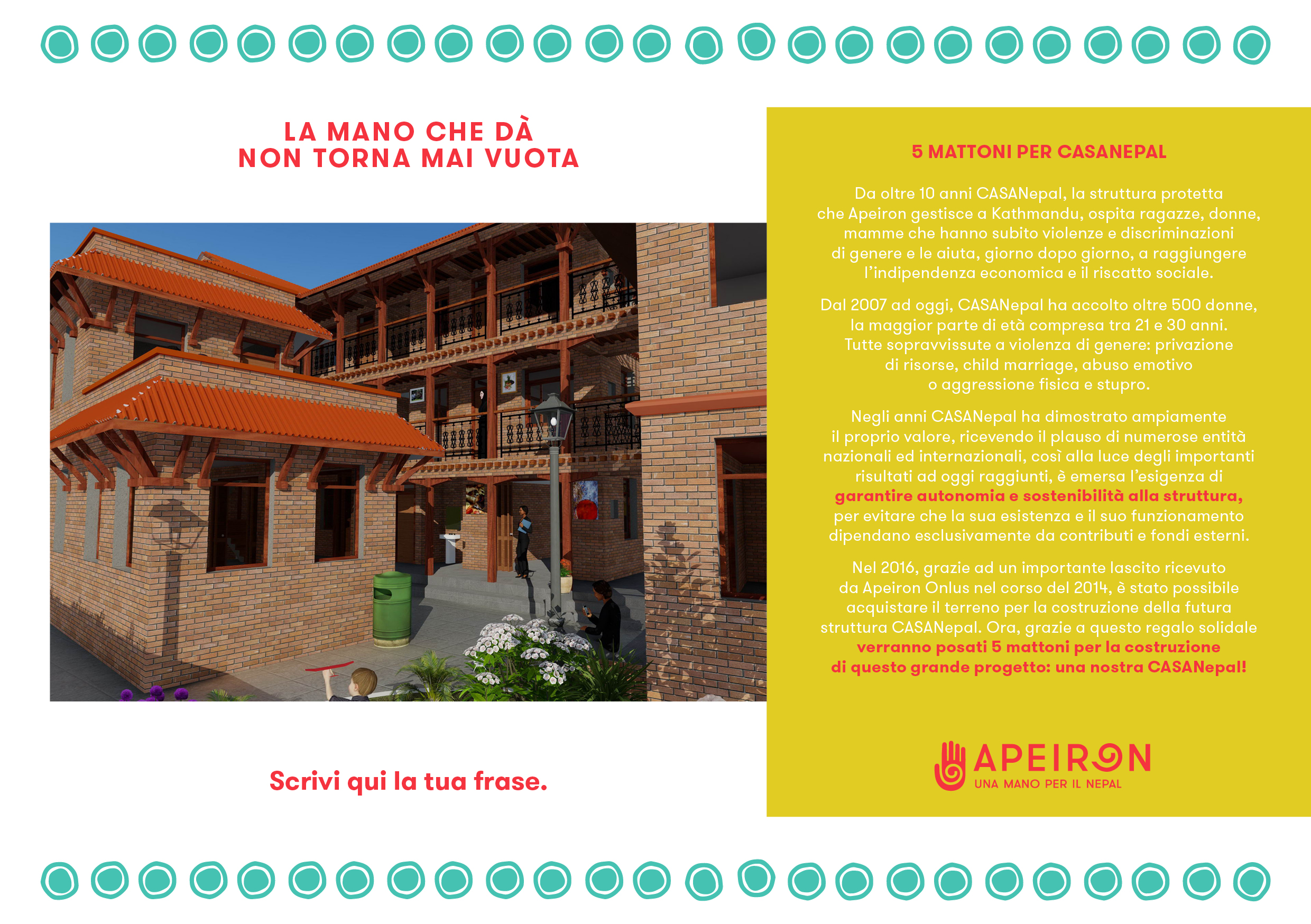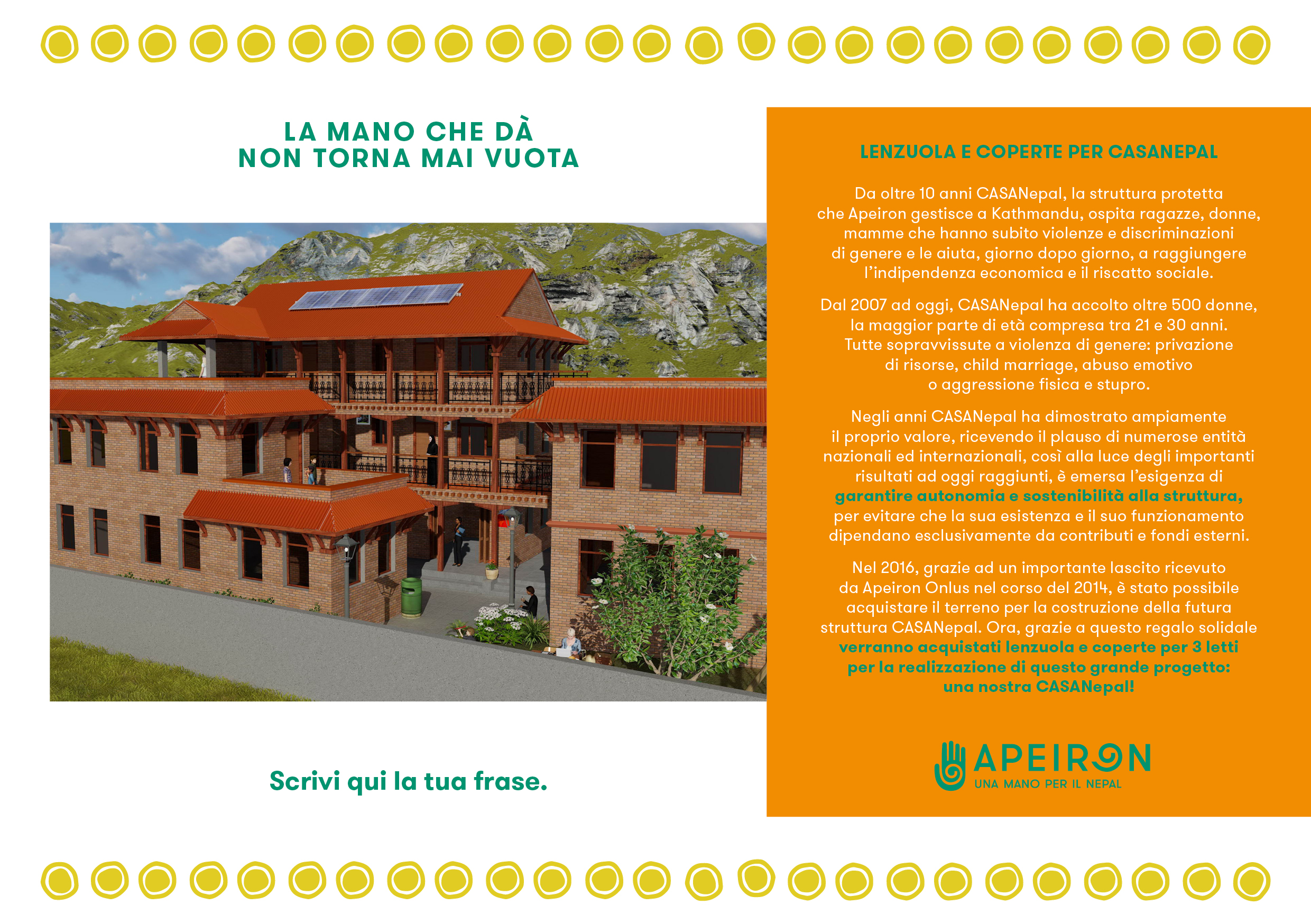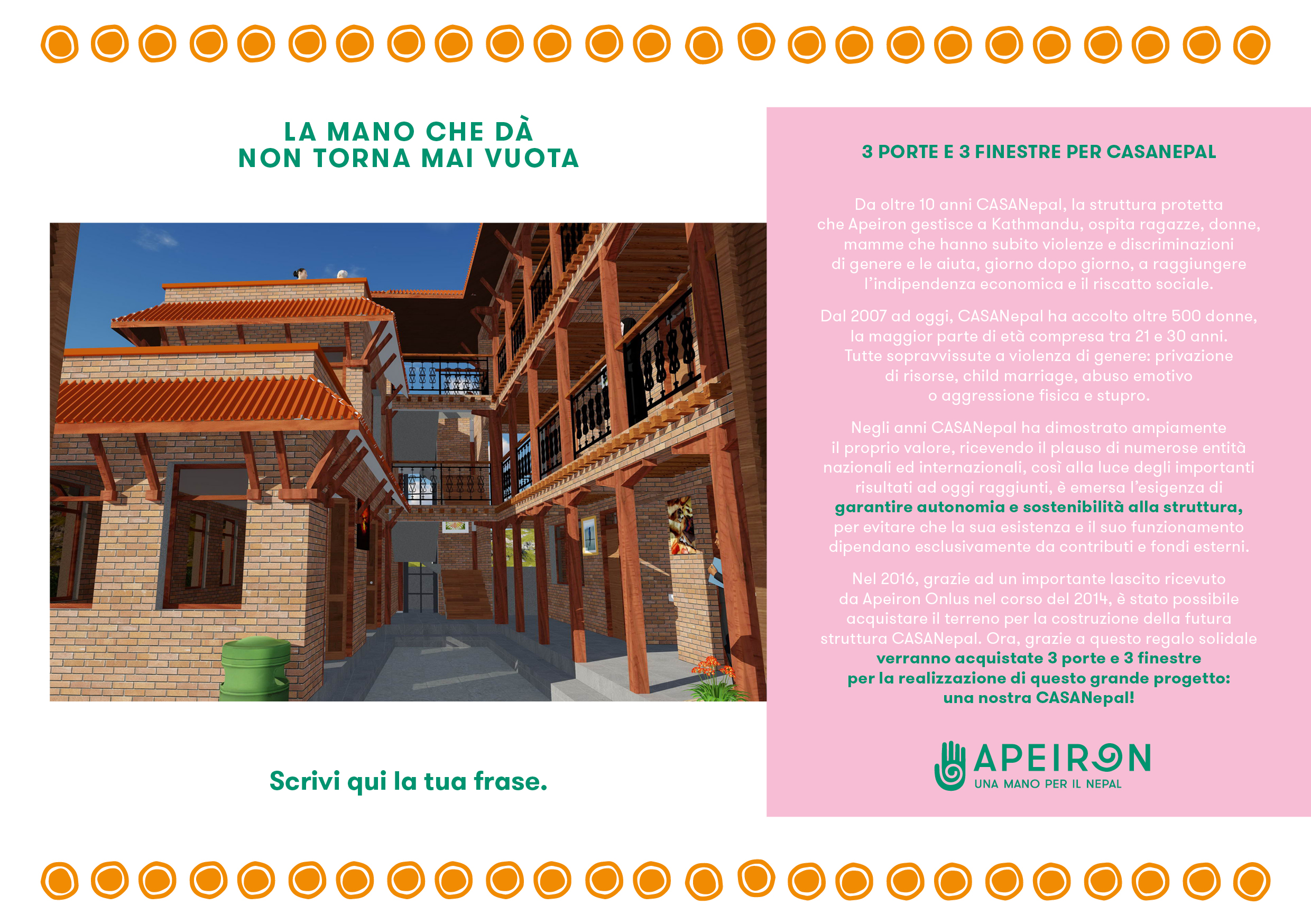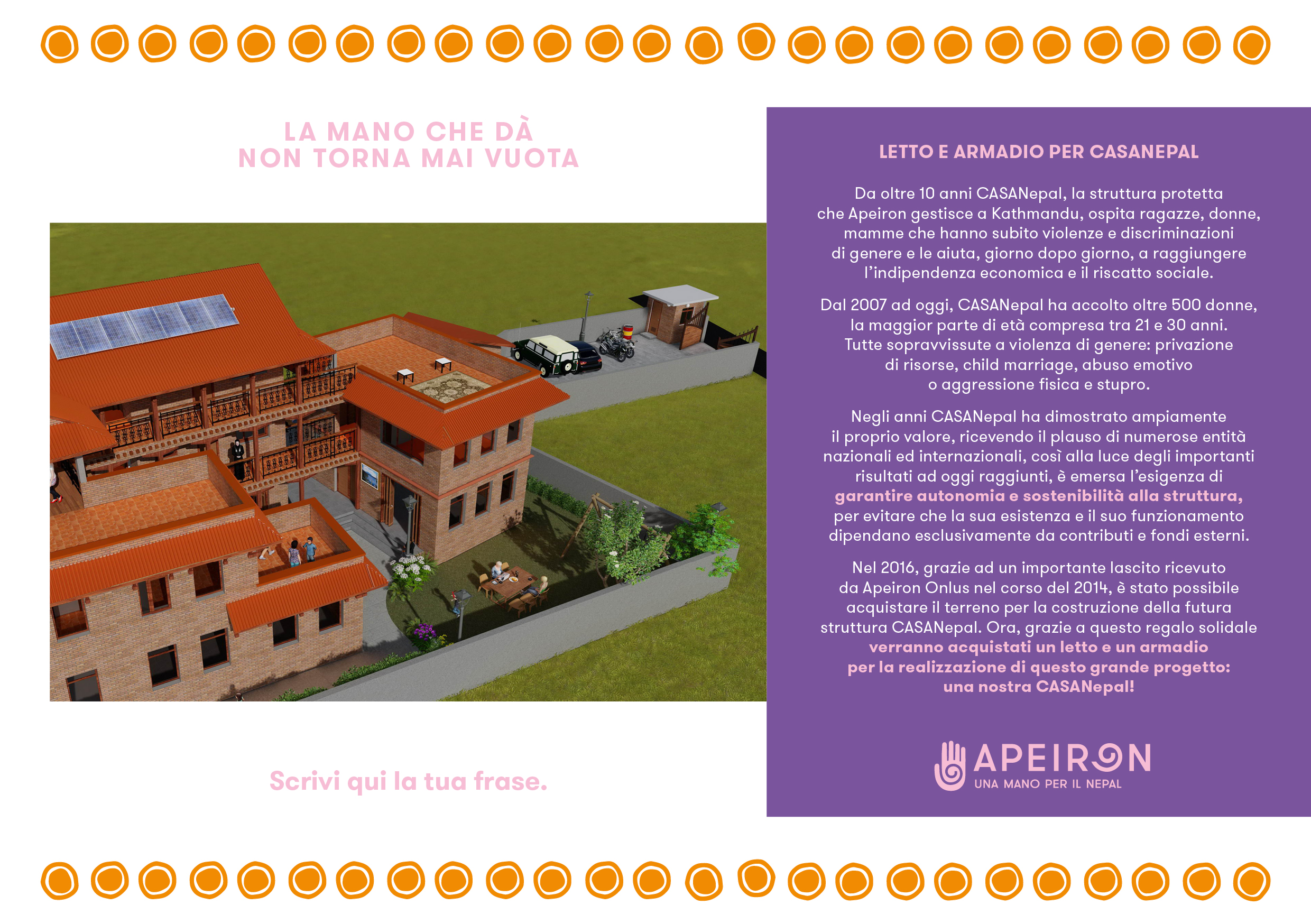 Negli anni CASANepal ha dimostrato ampiamente il proprio valore, ricevendo il plauso di numerose entità nazionali ed internazionali, così alla luce degli importanti risultati ad oggi raggiunti, è emersa l’esigenza di garantire autonomia e sostenibilità alla struttura, per evitare che la sua esistenza e il suo funzionamento dipendano esclusivamente da contributi e fondi esterni. CASANepal, con il suo approccio olistico e survivor-centered, ha infatti costi di gestione piuttosto elevati ed è diventato quindi di vitale importanza per Apeiron garantirne la sopravvivenza e, al tempo stesso, puntare ad un continuo miglioramento dei servizi offerti.