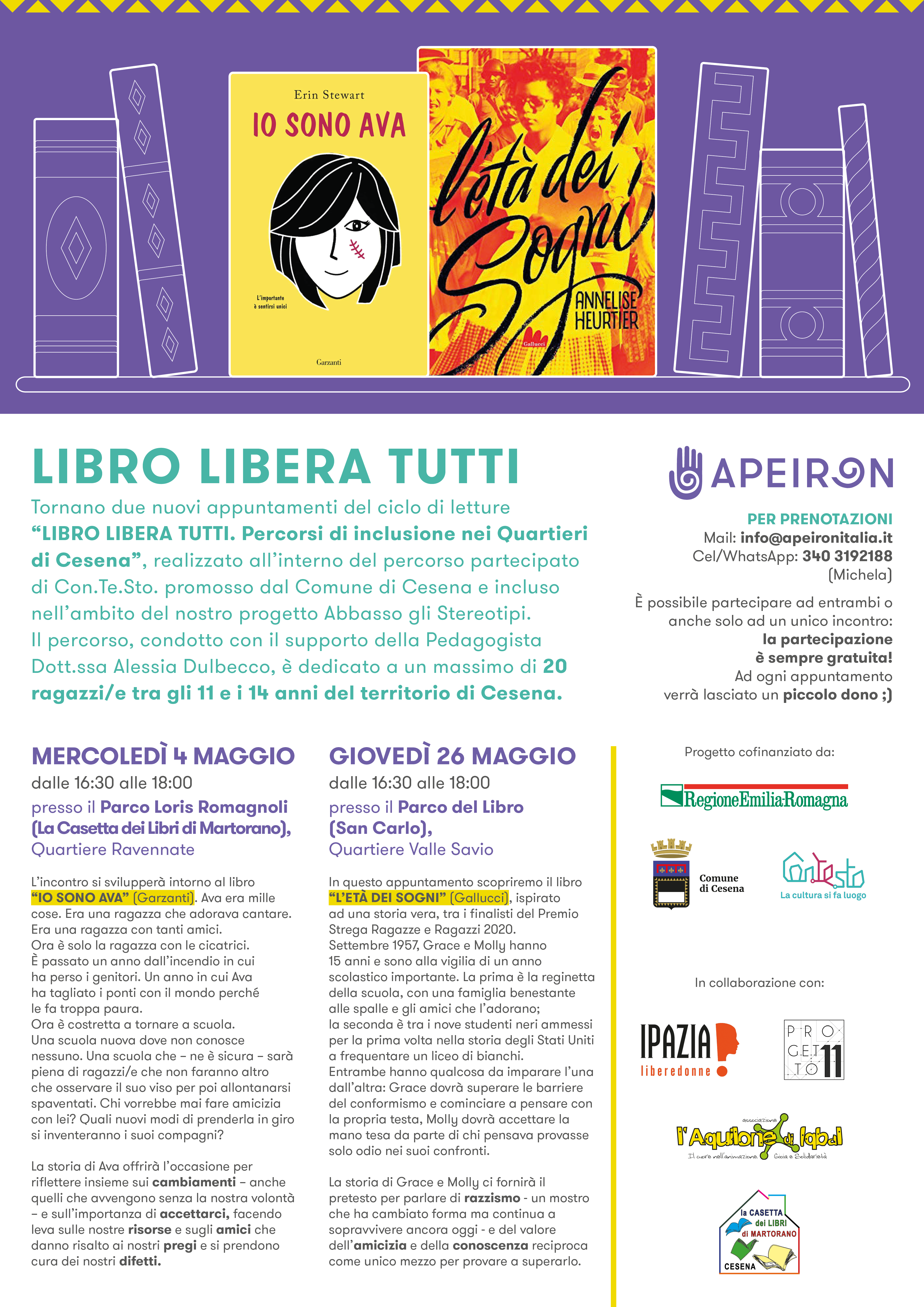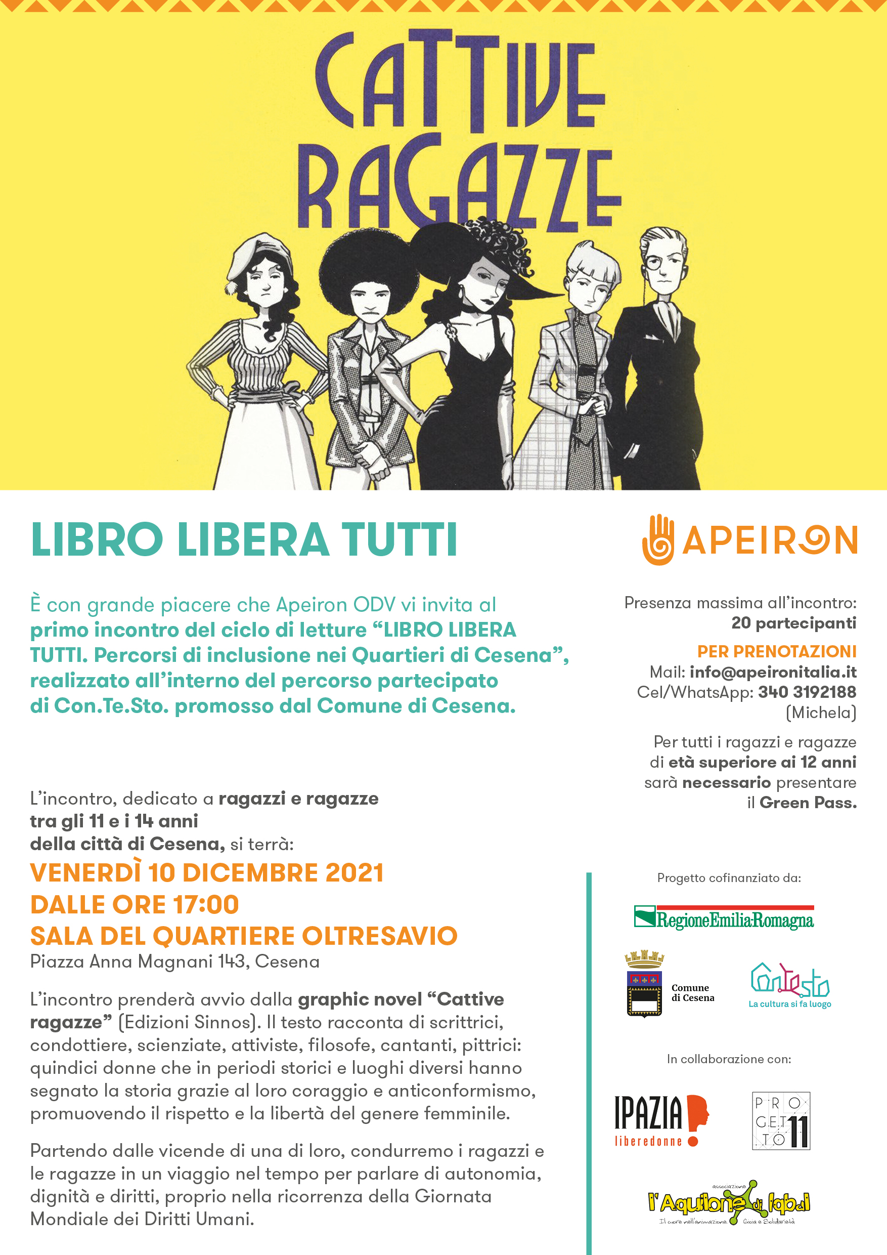 Tra dicembre 2021 e giugno 2022 è stato realizzato un ciclo di letture dedicato ai ragazzi e alle ragazze tra gli 11 e i 14 anni, realizzato all’interno del percorso partecipato Con.Te.Sto promosso dal Comune di Cesena con lo scopo di animare gli spazi pubblici dei numerosi Quartieri.
