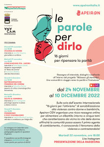 Sulla scia dell’evento internazionale “16 giorni per l’attivismo” di sensibilizzazione alla violenza contro donne e bambini/e, Apeiron ODV ha organizzato una ricca rassegna per alimentare un dibattito intorno a cinque temi che caratterizzano da vicino la vita delle donne, affinché la comunità possa essere il primo agente di cambiamento, ri-conoscendo il fenomeno della violenza e contrastandola. Il lavoro e la sua conciliazione con i tempi di vita, la salute, la rappresentazione, la decontrazione dello sguardo coloniale sul corpo femminile, la violenza di genere hanno costituito il cuore pulsante della rassegna!