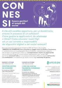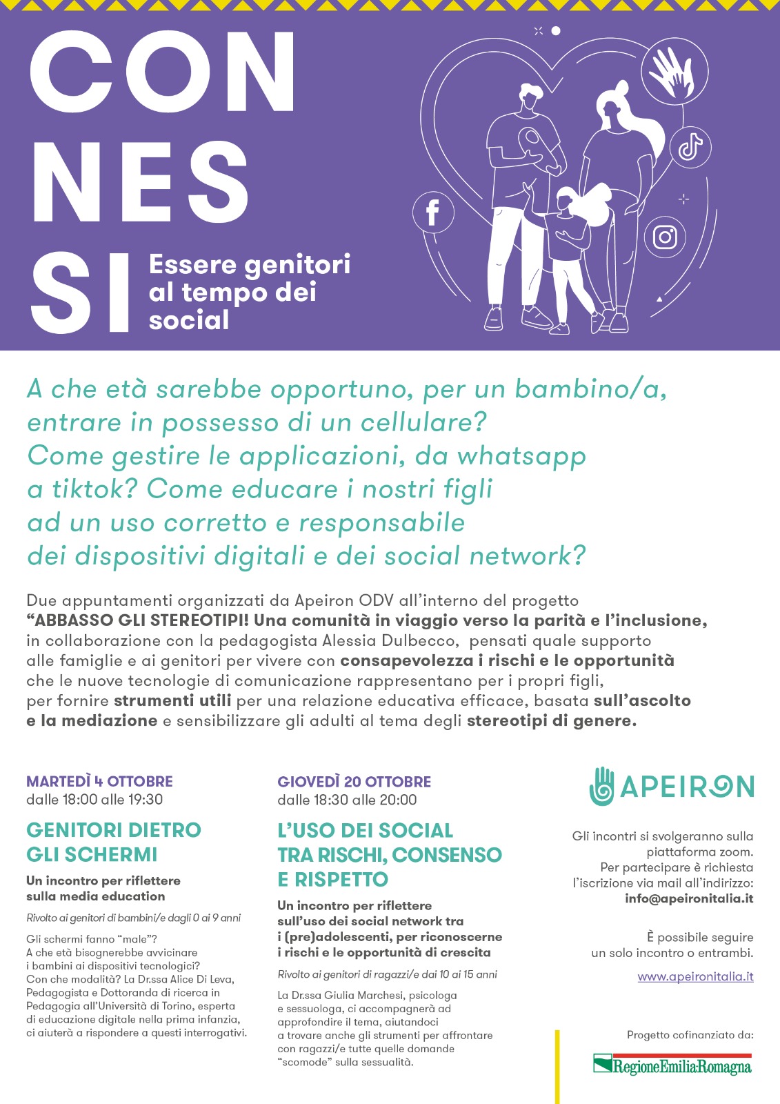 Il 4 e 20 ottobre 2022 si sono svolti online sulla piattaforma Zoom i due appuntamenti di “Connessi – Essere genitori al tempo dei social”, dedicati ai genitori e agli insegnanti, per riflettere sui rischi e le opportunità che le nuove tecnologie di comunicazione rappresentano per i/le bambini/e e per gli/le adolescenti di oggi.